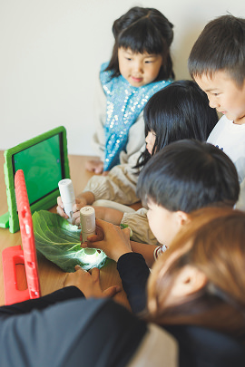 デジタルとの共存が当たり前となった今、「幼児期にタブレットはふさわしくない」という声も耳にします。当園で導入しているKitS(きっつ)は、ちょっと異なる「魔法の道具」のようなデジタルツール。例えば、工作や虫探し、おままごとなど、いつもの遊びをすこしデジタルの力を借りて拡張することができるのです。ハサミやクレヨンと同じように自由に使って夢中になって、工夫して、ときには手をよごしながら、自分の世界をのびのびと広げていく。そんな姿を、そっと後押ししてくれる教材です。